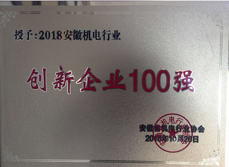 安徽機電行業(yè)創(chuàng)新企業(yè)100強證書
